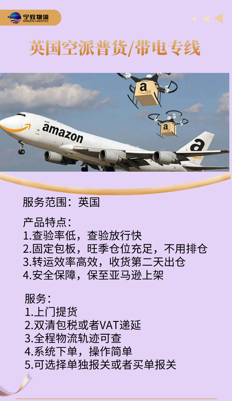 宁致物流将不忘初心,继续前行,不断创新和优化完善物流渠道服务体系,并能提供订制、专业、高效的全方位国际物流解决方案。 宁致物流公司渠道: 1.英国空派快线(可选择含税/自主VAT含税/自主VAT不含税/VAT递延不含):每周固定航班板位飞英国伦敦清关,时效5-8个自然日提取,此渠道主打时效稳定服务。 2.英国空派经济线(可选择含税/自主VAT含税/自主VAT不含税/VAT递延不含):匹配大陆优质航班飞英国伦敦清关,时效10-12个自然日提取,此渠道价格性价比极高。 3.欧洲空派比利时清关(可选择包税/VAT递延不含税):固定包机航班,时效7-10个自然日提取。 4.欧洲海运含税(可选择UPS/DPD派送):开船后35个自然日提取,性价比高,整体时效稳定性好。 5.欧洲铁路含税(UPS 派送):开班列后35个自然日提取,性价比较高的含税物流渠道。 6.英国海运DPD派送:可选择走自主VAT不含税/VAT递延不含税,开船30个自然日提取。 7.英国卡航不包税:可选择走含税/自主VAT不含税/VAT递延不含税,装柜后22-25个自然日提取。 8.欧洲卡航包税:可选择走含税/VAT递延不含税,装柜后22-25个自然日提取。 9.美森快船正班船含税(可选走UPS派送或者卡派),开船后16天提取,18-22天签收。 10.美森快船加班船含税(可选走UPS派送或者卡派),开船后22-26天提取,26-30天签收。 11.盐田海运定提含税(可选走UPS派送或者卡派),开船后26-30天提取,30-34天签收。