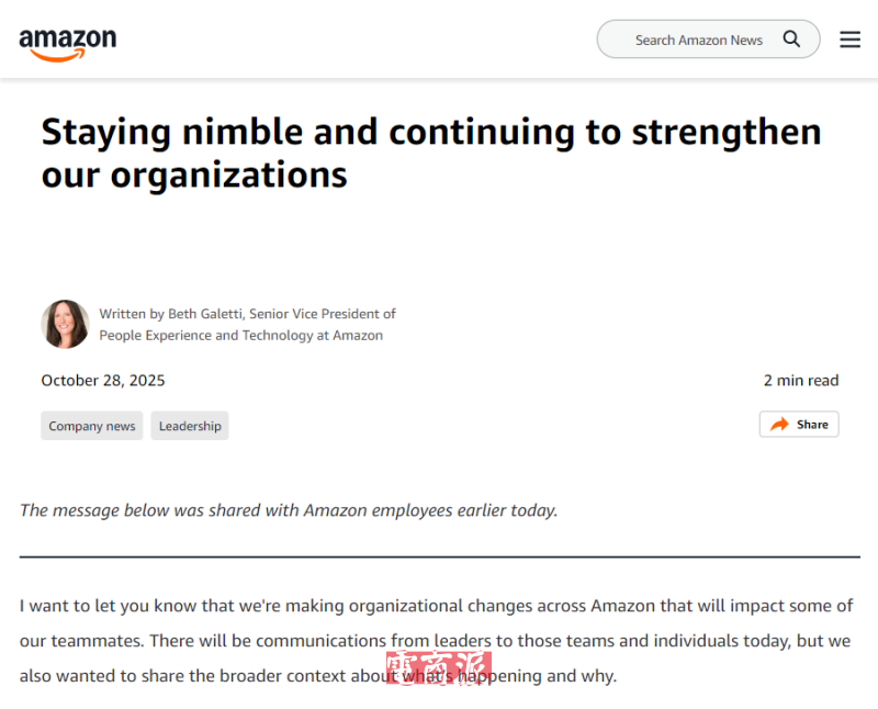 10月29日消息,亚马逊宣布,计划裁减约1.4万名公司职员,以精简运营、加快人工智能部署。亚马逊人力体验与技术高级副总裁贝丝·加莱蒂当日致信员工说,人工智能是自互联网诞生以来最具变革性的技术,使企业能...