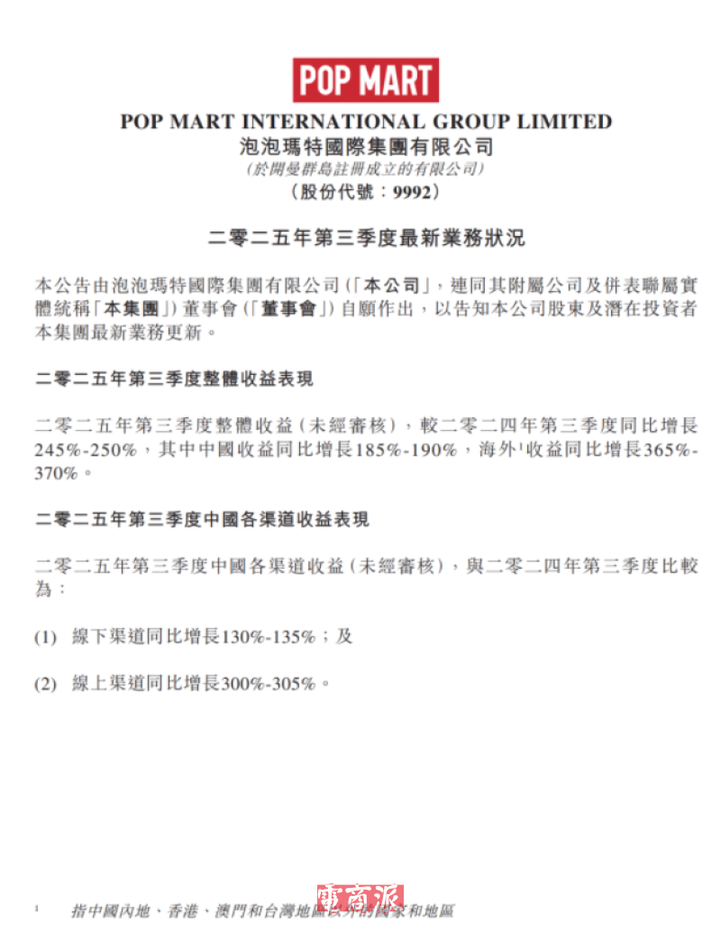 1.最新业绩公布 在跨境电商行业蓬勃发展的当下,潮玩领域正逐渐成为一颗耀眼的新星。 近日,泡泡玛特发布最新公告称,2025年第三季度整体收益较2024年同期增长245%-250%,其中,中国收益同比增...