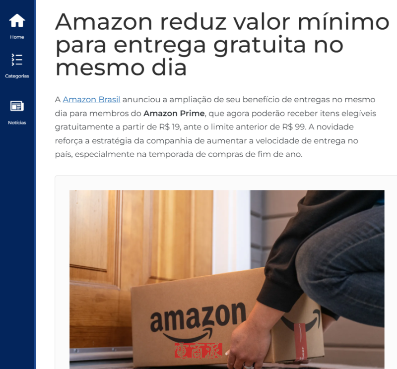 10月17日消息,亚马逊巴西宣布,扩大Prime会员的“当日达”免费配送服务范围,并将该服务的最低购物金额从此前的99雷亚尔降至19雷亚尔。此举旨在加快配送速度,提升用户体验,尤其是在年终购物旺季期间...