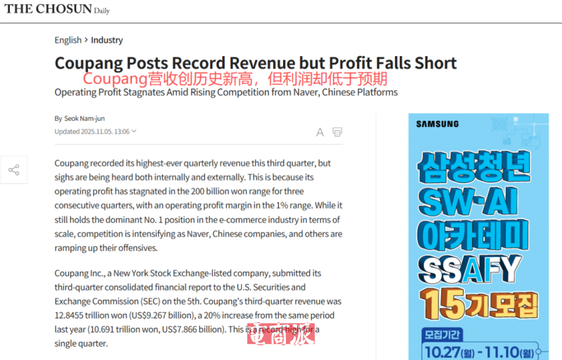 1.最新财报 韩国电商巨头Coupang近日发布了第三季度的财报,亮眼数据既印证了其本土市场的深厚根基,也暗藏着增长背后的复杂挑战。 详细来看,在截至9月30日的三个月里,Coupang净利润同比增长...