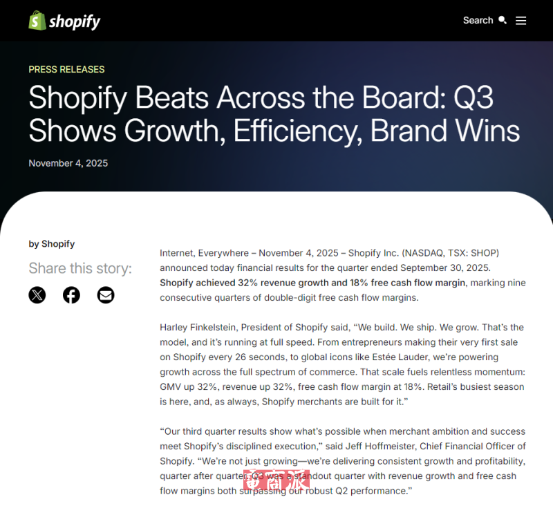 11月5日消息,Shopify发布2025年第三季度财务报告。财报显示,Shopify第三季度营收28.44亿美元,同比增长32%;毛利润达13.91亿美元,同比增长24%;经营利润达3.43亿美元,...