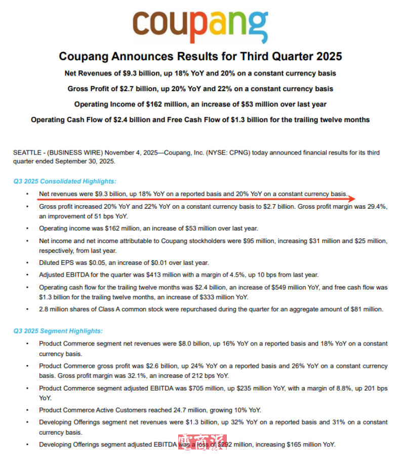 11月5日消息,Coupang发布2025年第三季度财报。财报显示,Coupang第三季度营收达93亿美元,同比增长18%,若按固定汇率计算则增幅为20%;毛利润增至27亿美元,同比增长20%,毛利率...