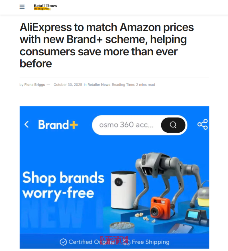 11月1日消息,速卖通(AliExpress)近日在英国推出全新品牌频道“Brand+”,该计划汇集了品牌精选、价格匹配及优惠活动,是平台迄今最全面的品牌与价格保障计划。若消费者在购买后的7天内在指定...