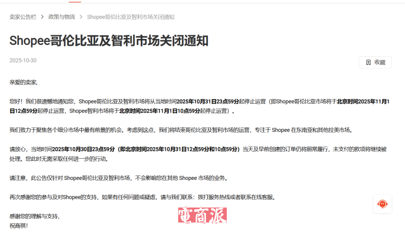 11月2日消息,Shopee近日宣布退出智利与哥伦比亚市场,其在拉美地区仅保留墨西哥与巴西两个站点。该平台表示,自当地时间2025年10月31日23:59起,智利和哥伦比亚将不再接受新订单,已有订单将...